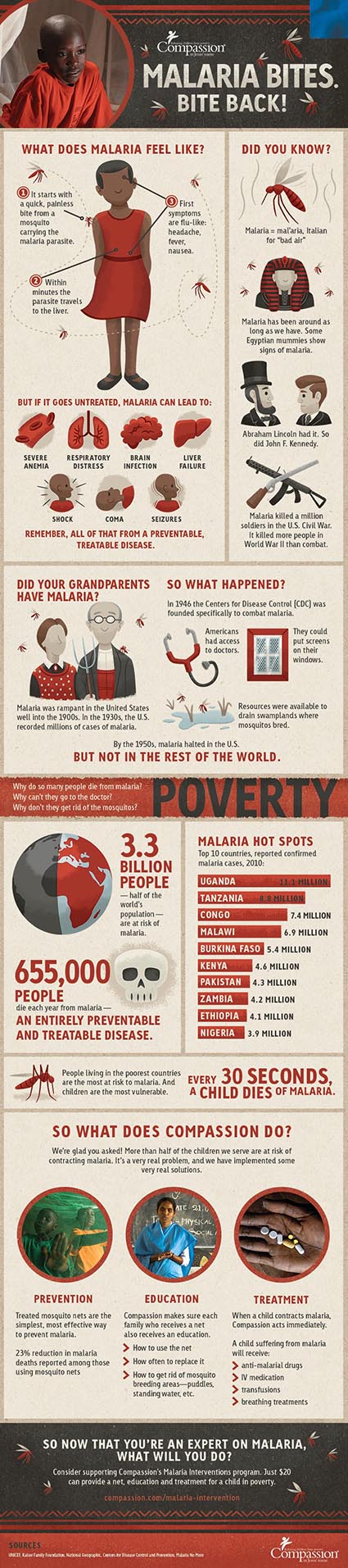 Fortunately, malaria is preventable and treatable. A donation of $20 to Compassion International’s “Bite Back” campaign provides two mosquito bed nets to those in need. You can donate here: http://www.compassion.com/malaria-intervention.htm. Compassion provides nets and education to at-risk families as well as treatment to those already suffering from malaria.